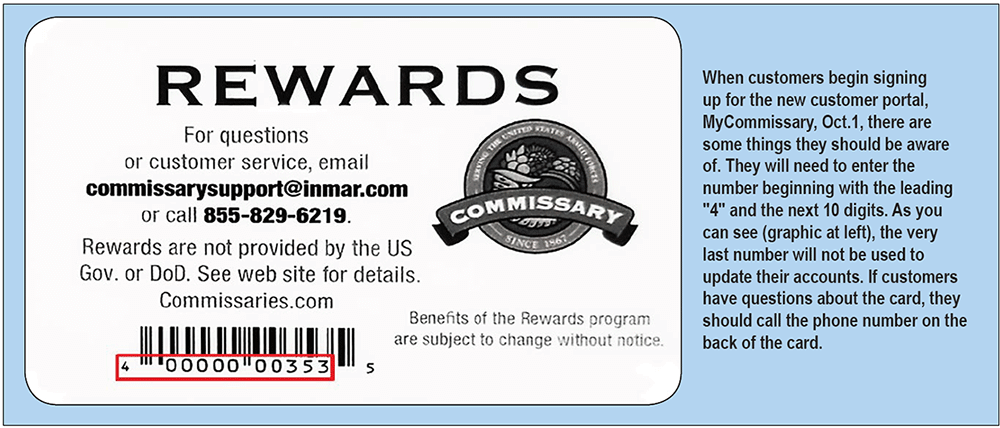 2. REWARDS CARD REGISTRATION.  Once you have obtained a Rewards Card from your local commissary you must register the card on the MyCommissary website to start saving.  The Rewards Card is registered by adding the card number (the leading 4 and the next 10 numbers following the 4) to the Loyalty ID field in your account information on the Site. An Alternate ID number may optionally be entered.